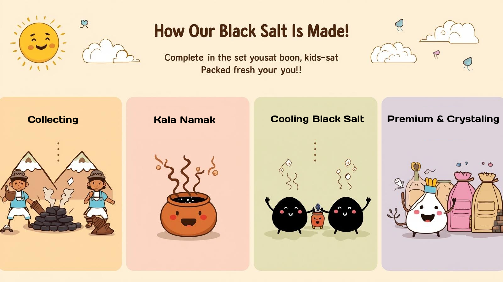 Black salt (kala namak) is traditionally manufactured through a multi-step process. First, high-quality Himalayan salt crystals are selected and mixed with natural herbs such as amla, harad, and babool bark, sometimes including ammonium chloride to enhance flavor. This mixture is then filled into large clay pots and sealed with natural clay to ensure controlled heating. The sealed pots are placed in a traditional furnace layered with glowing coals and cow dung, where they are heated for several hours, causing chemical transformations that turn the raw mixture into black salt. After cooling, the clay pots are broken, the salt is sieved to remove impurities, and finally, it is packaged into small bags ready for sale, preserving its unique aroma, taste, and therapeutic properties.